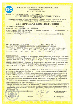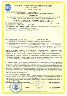 Установка подготовки импульсного газа (УПИГ) сертификат СМК+ ИНТЕРГАЗСЕРТ